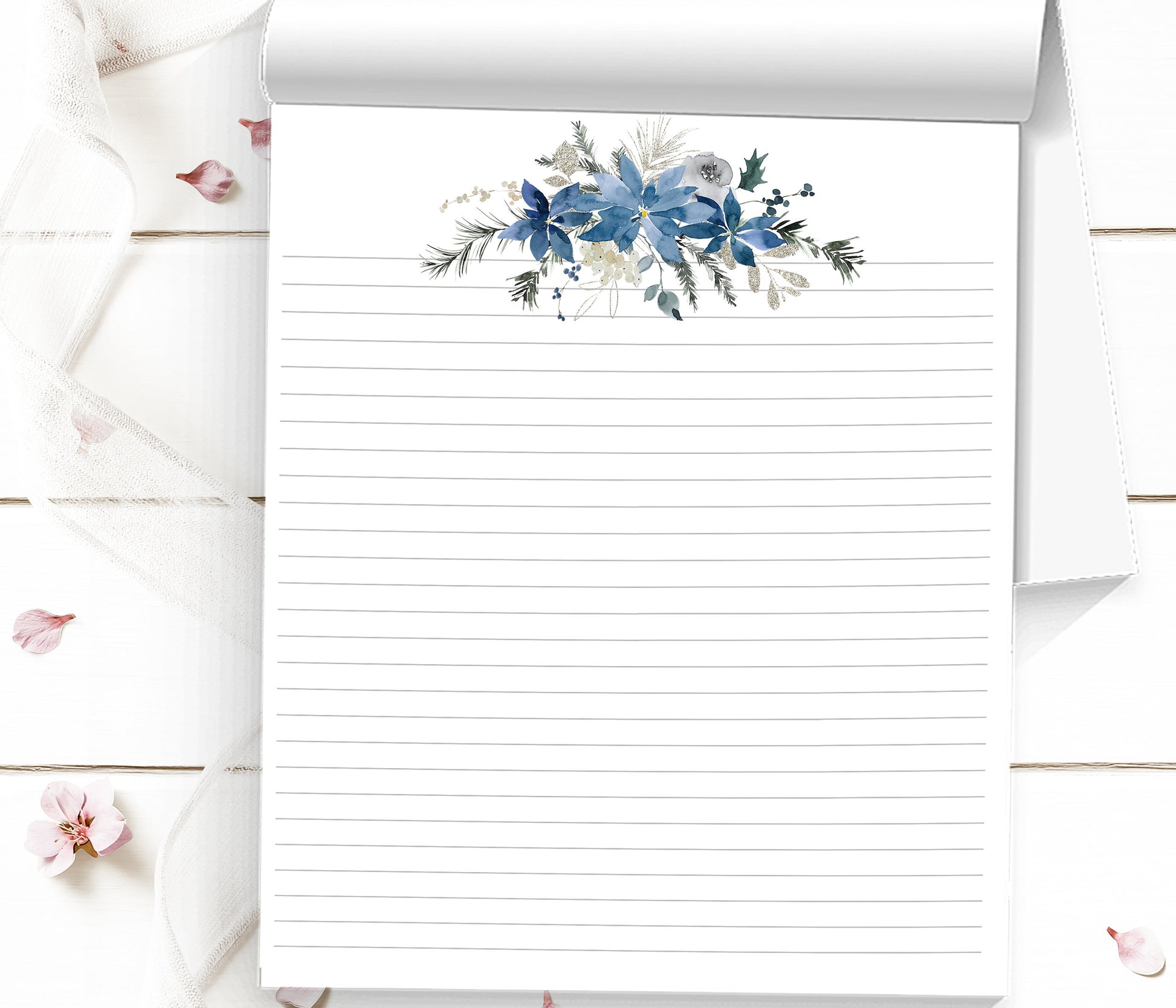 Blue Floral Christmas Notepad - Holiday Stationery with 50 or 100 Sheets